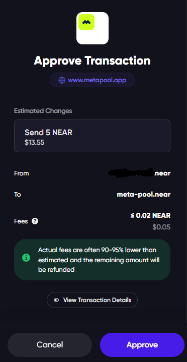 6\) **$AURORA and $wNEAR Permission and Fee:** To operate with $AURORA and $wNEAR, the selected wallet will request permission to be provided in order to stake. This is done by approving the amount to be authorized in a transaction prior to stake approval. Therefore, two actions are required to stake.&#x20;