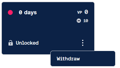 If you decide to stop participating in the DAO and remove your tokens or partially remove your tokens, you can start the unbonding period. By pressing the "Start Unbonding" button in a locked position, the unboding period will start. The unboding period is the number of days selected at locking time.